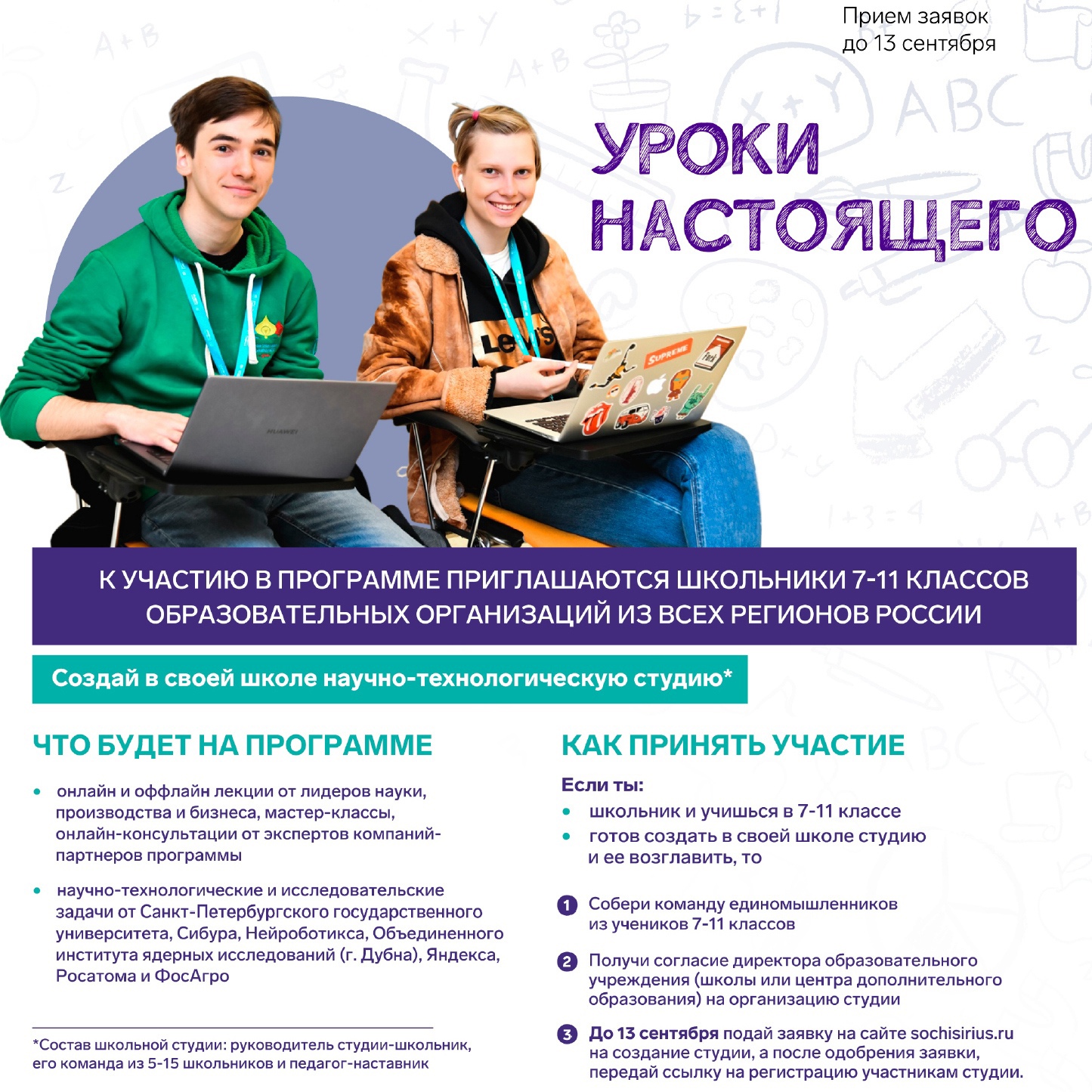 Заявку на участие в «Уроках настоящего» подает руководитель студии (школьник 7-11 класса), получивший согласие директора школы на организацию в ней студии. Заявки принимаются до 13 сентября включительно на сайте sochisirius.ru.