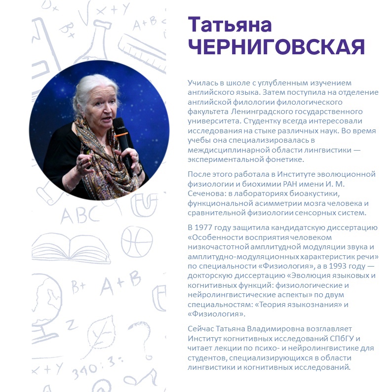 Предлагаем вам поближе познакомиться с Татьяной Черниговской (посмотрите интервью) и приглашаем к изучению материалов цикла.