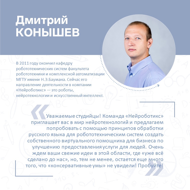 Научным лидером четвертого цикла станет Дмитрий Владимирович Конышев, руководитель отдела разработки программного обеспечения компании «Нейроботикс». 8 декабря он проведет онлайн-лекцию, где вы познакомитесь: